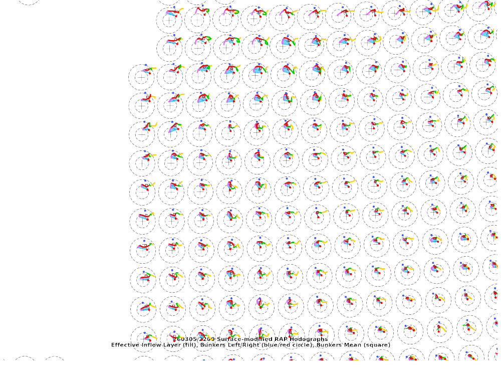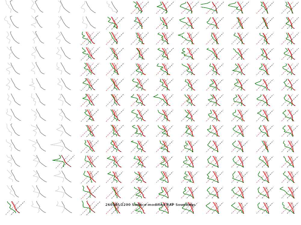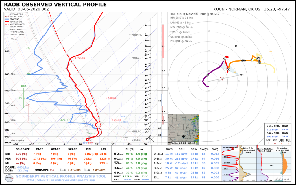 Norman launched a 21Z Special sounding which showed a great supercell environment. When launched, the surface temperatures in Norman had not warmed. After the balloon was in flight, the sun came out in Norman, and temperatures rose to 74/64 at the Norman Mesonet. I modified the surface in the right Skew-T, which gave us a bit more CAPE.