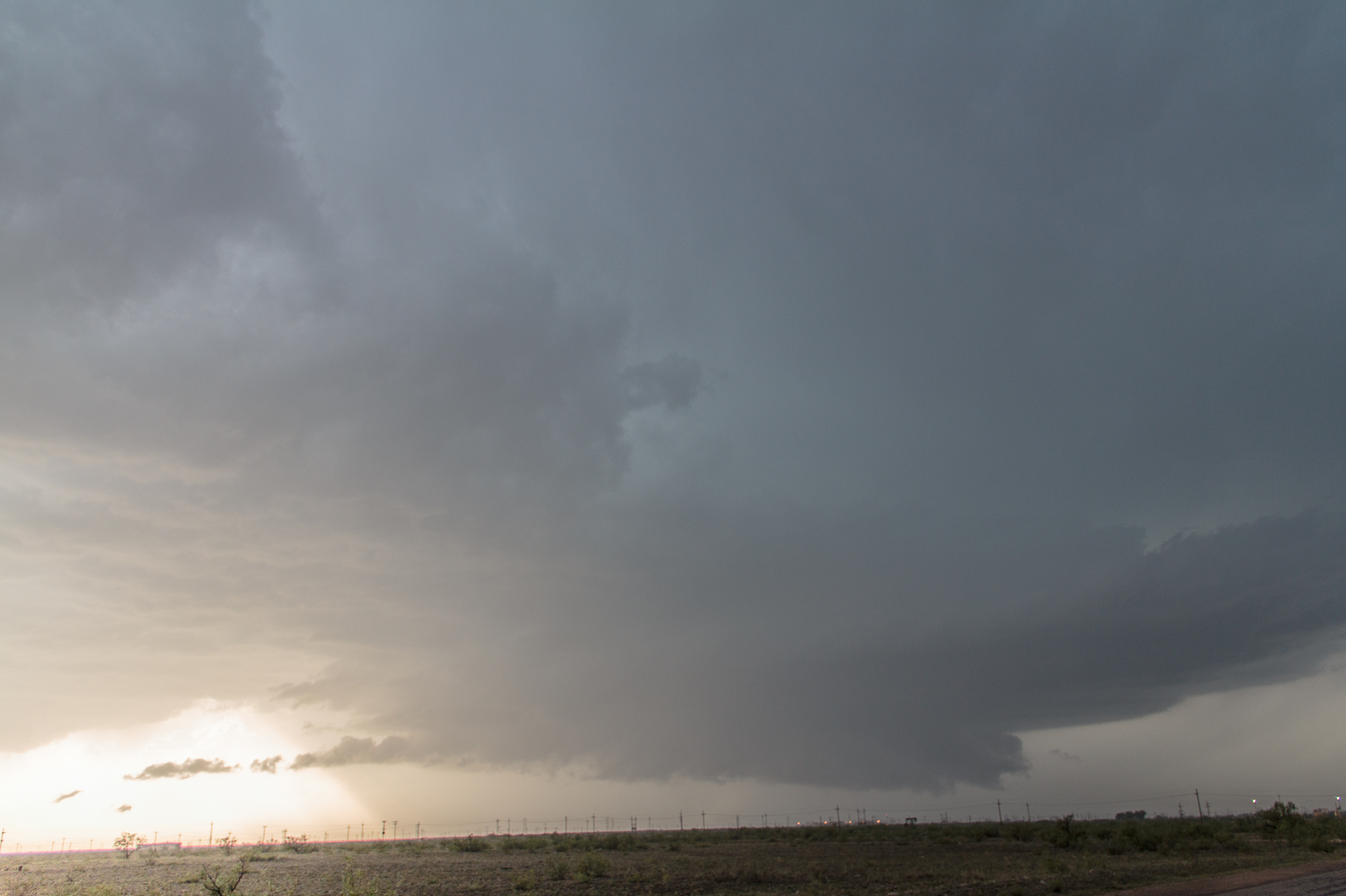 Eventually, we ended up back north and west of Hobbs near the most interesting part of the storm. It appeared our storm was contending with outflow from the storm to our north that had also developed. We witnessed a definite wall cloud and some rapid motion, but it seemed to be having cold air undercutting. It was extremely hard to give up on this storm, but we eventually had to and headed south again to try and keep up with the storm.