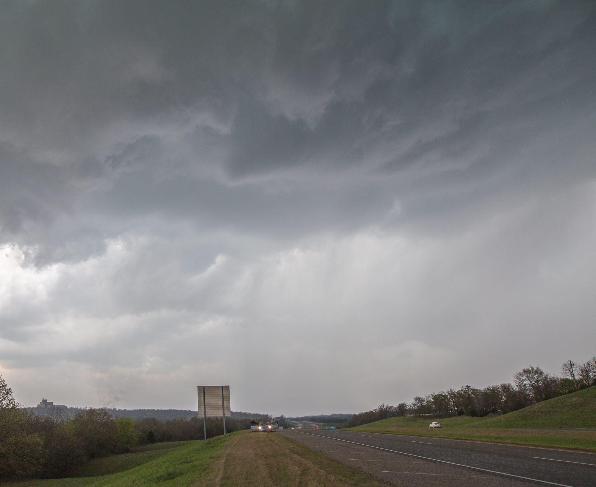 We headed into Ada through some hail up to nickel size, stopped quickly for a bathroom break and then decided to head south as the storm seemed to be wrapping up on radar. Norman NWS issued a tornado warning on it, so we dropped south of town and observed the first tornado(es?) right along the south side of town along Highway 3. We continued east on Old highway 3, observing more tornadoes before navigating through the rough terrain and poor road network.